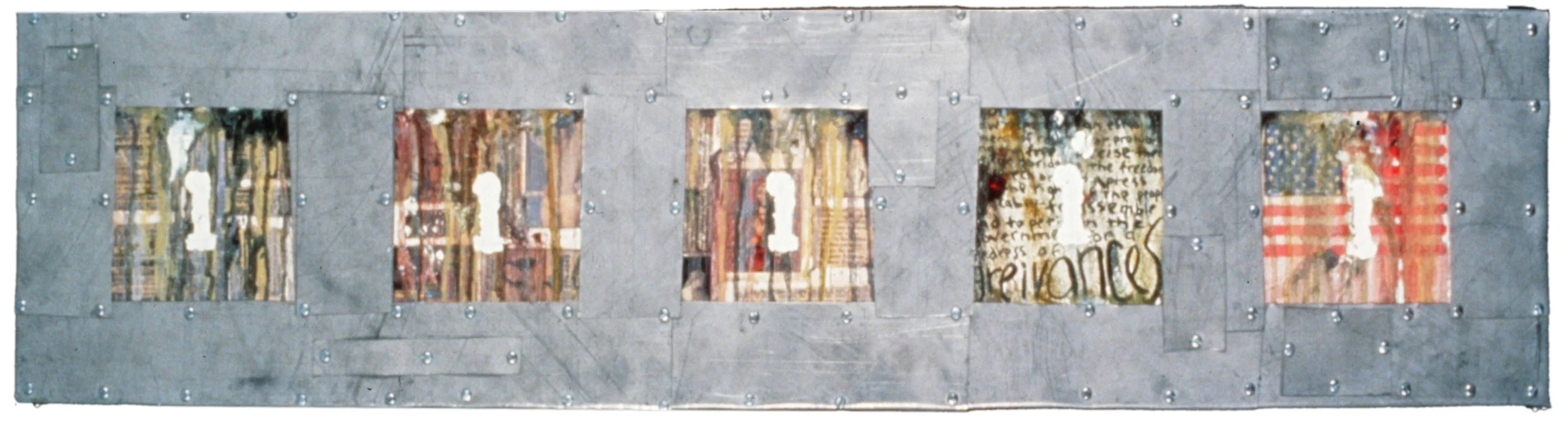 “5x1=0” 45” x 11.5” Oil, Colage and Metal on Wood ©1990